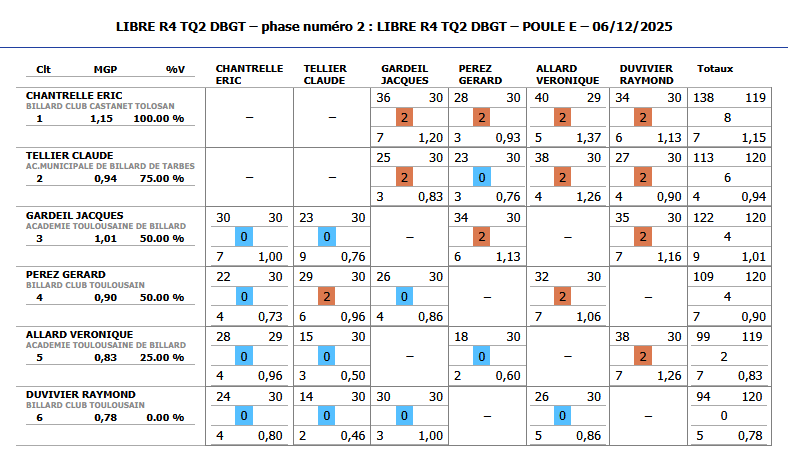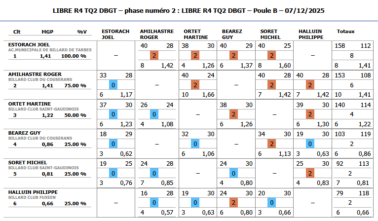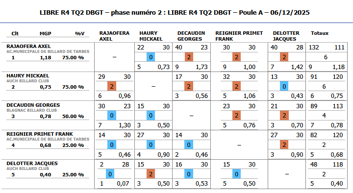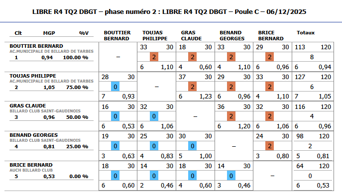 La compétition de libre R4 s’est déroulée à Tarbes, Auch et Toulouse le samedi 06/12/2025, puis à St Lizier le dimanche 07/12 pour les joueurs de l’ A.M.B.T., avec les résultats suivants. De très bons résultats de nos compétiteurs du club, avec, sur quatre poules, trois vainqueurs et deux seconds.
