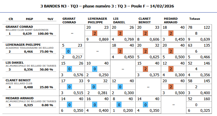La compétition s’est déroulée dans les locaux de l’ A.M.B.T. le samedi 14/02/2026 avec les résultats ci-dessous.
