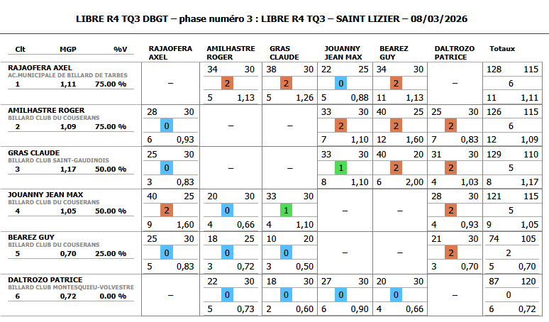 La compétition de libre R4 s’est déroulée à Tarbes et Auch le samedi 07/03/2026, puis à St Lizier le dimanche 08/03 pour les joueurs de l’ A.M.B.T., avec les résultats suivants.